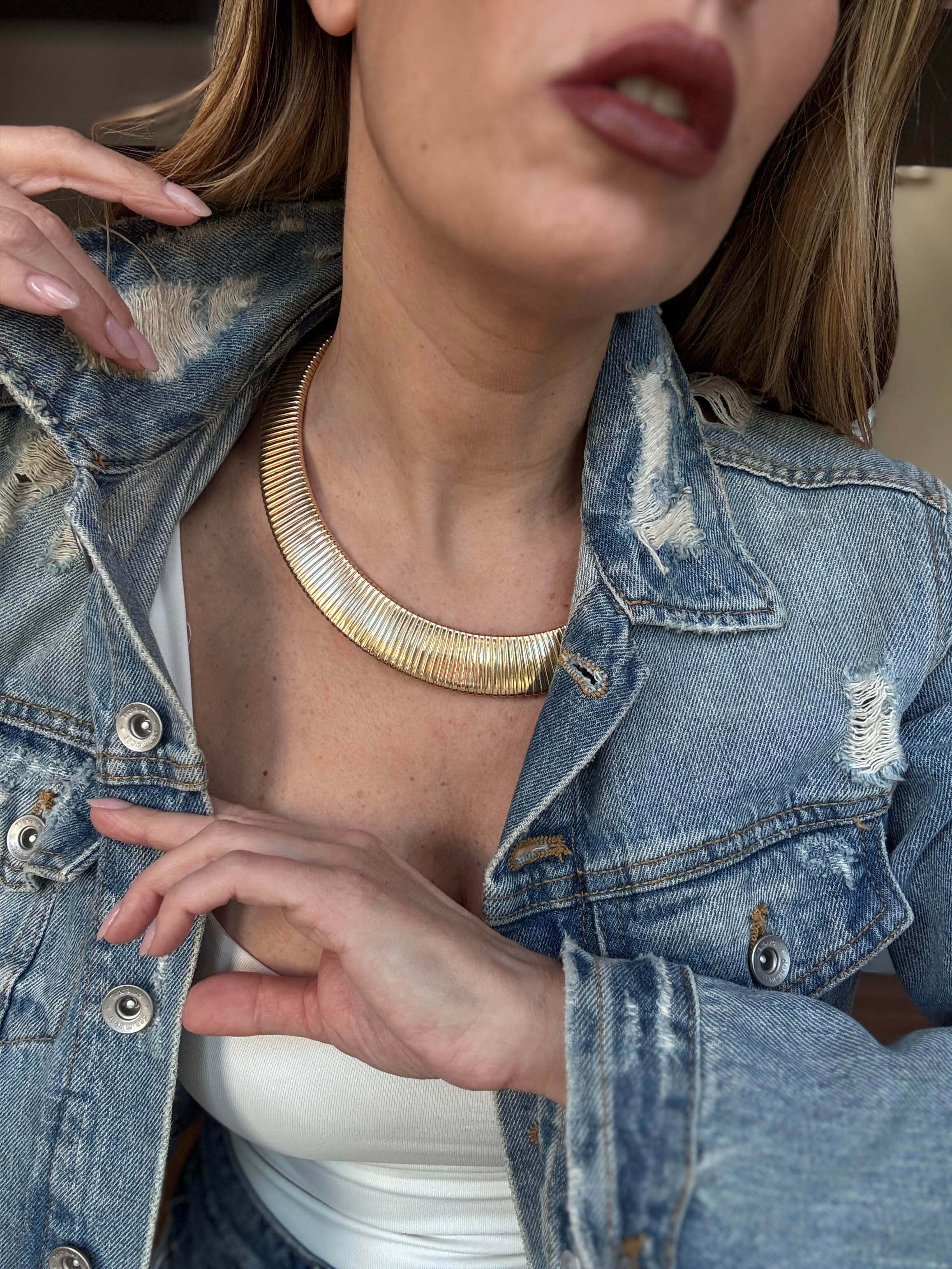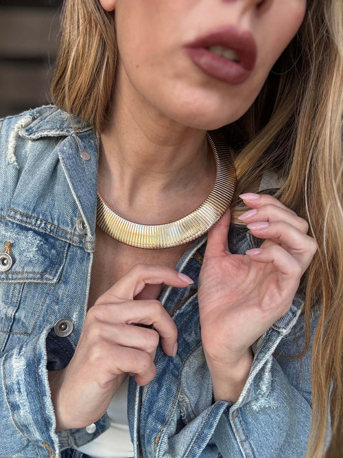 Collana dal design rigido e plissettato, elegante e contemporanea. Realizzata in acciaio inossidabile, è dotata di moschettone con catenina per regolare la lunghezza e adattarsi a diversi look.