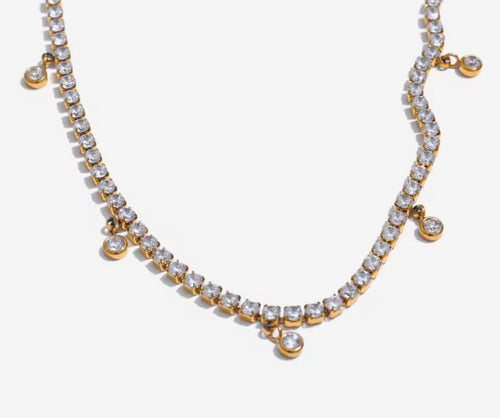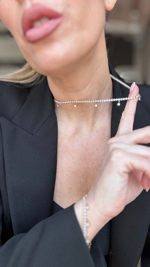 Una fila continua di zirconi che illumina il collo con eleganza, arricchita da piccoli charm scintillanti che si muovono delicatamente ad ogni passo.