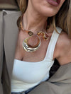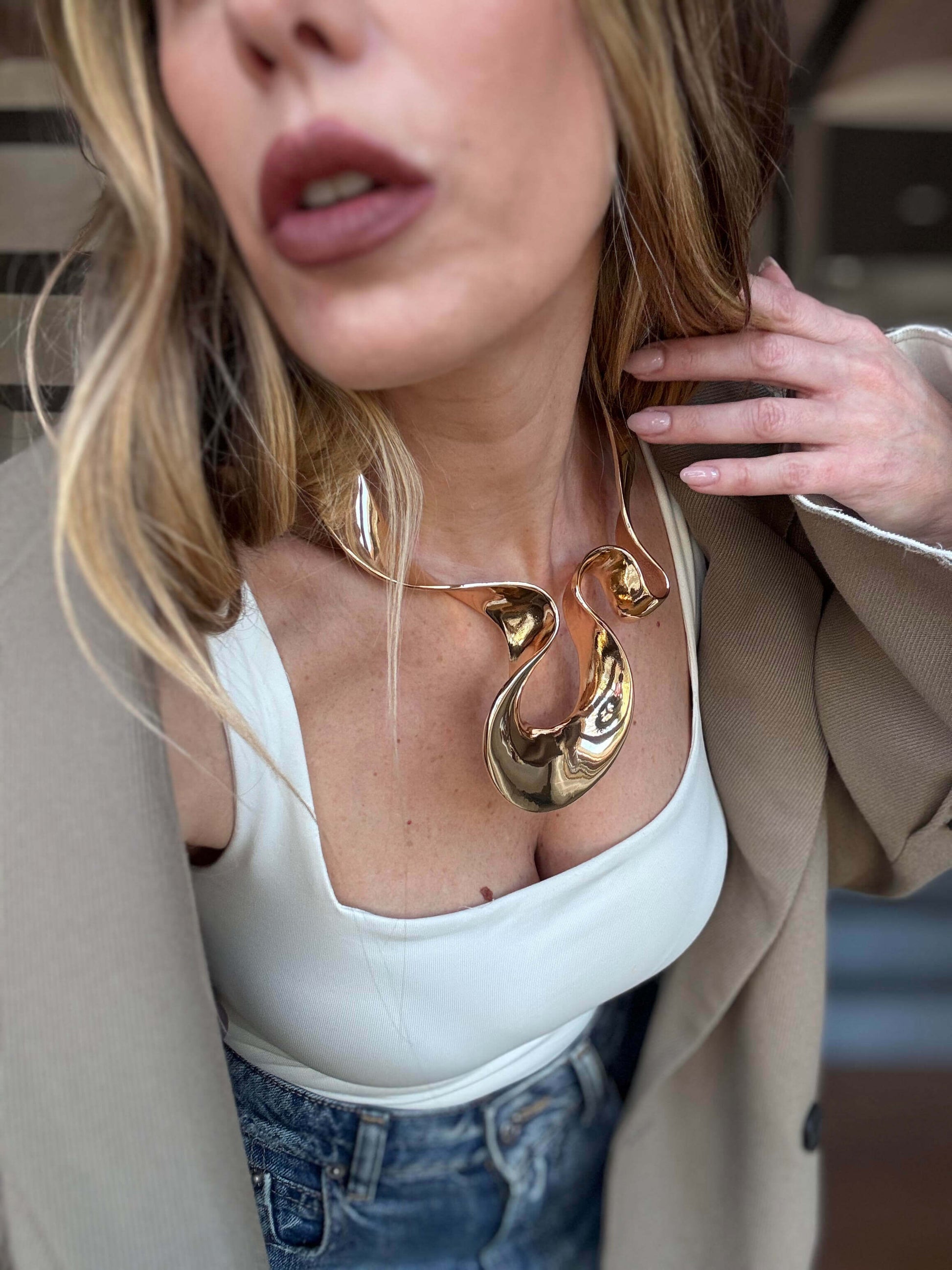 Collana dal design scultoreo e contemporaneo. Le linee fluide e organiche creano un effetto statement elegante, pensato per valorizzare il décolleté con carattere e raffinatezza. La chiusura regolabile consente una vestibilità versatile, adattandosi a diversi look e occasioni.