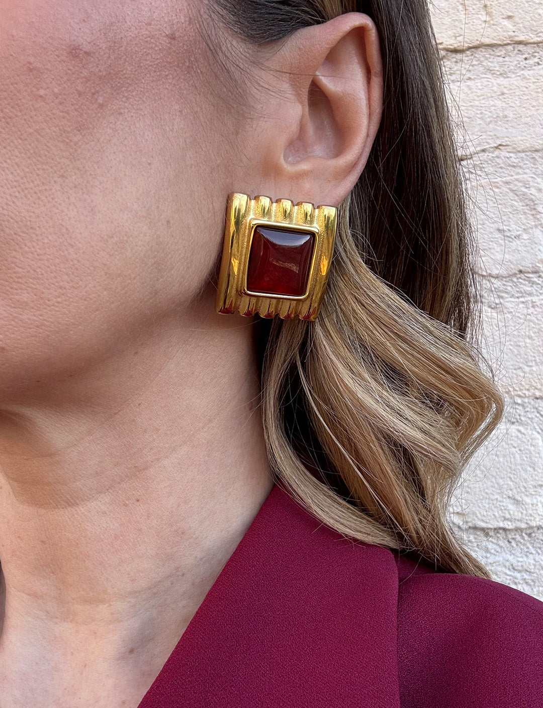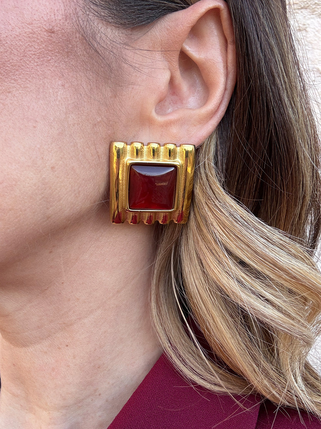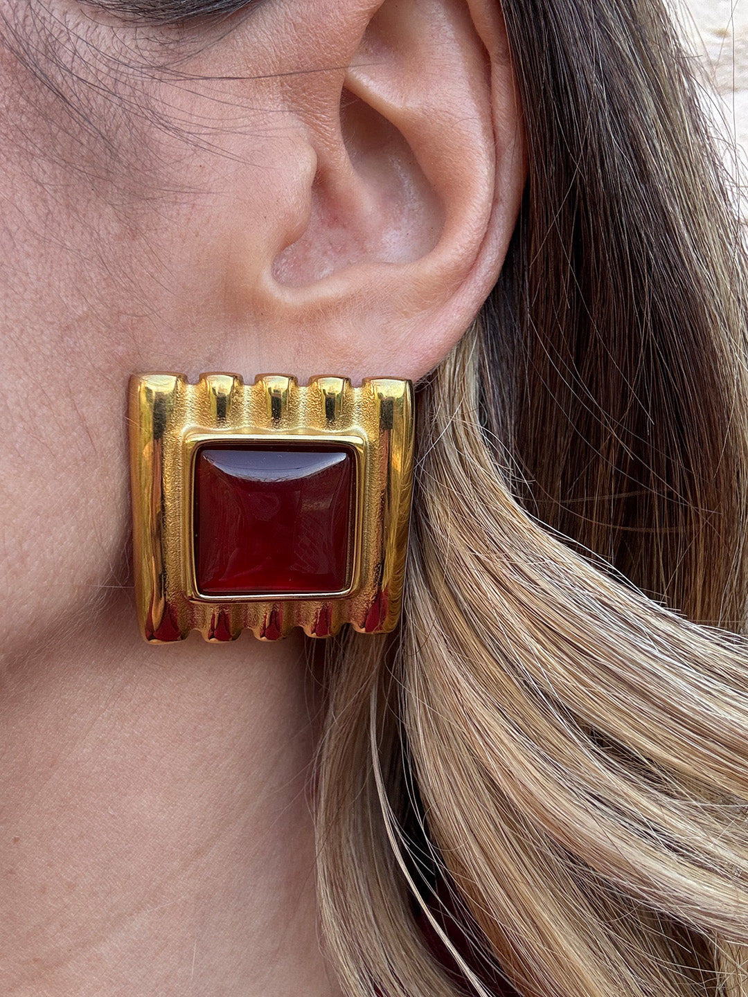 Orecchini a lobo dal design geometrico con inserto quadrato bordeaux e cornice dorata strutturata. Realizzati in acciaio inossidabile, decisi ed eleganti.