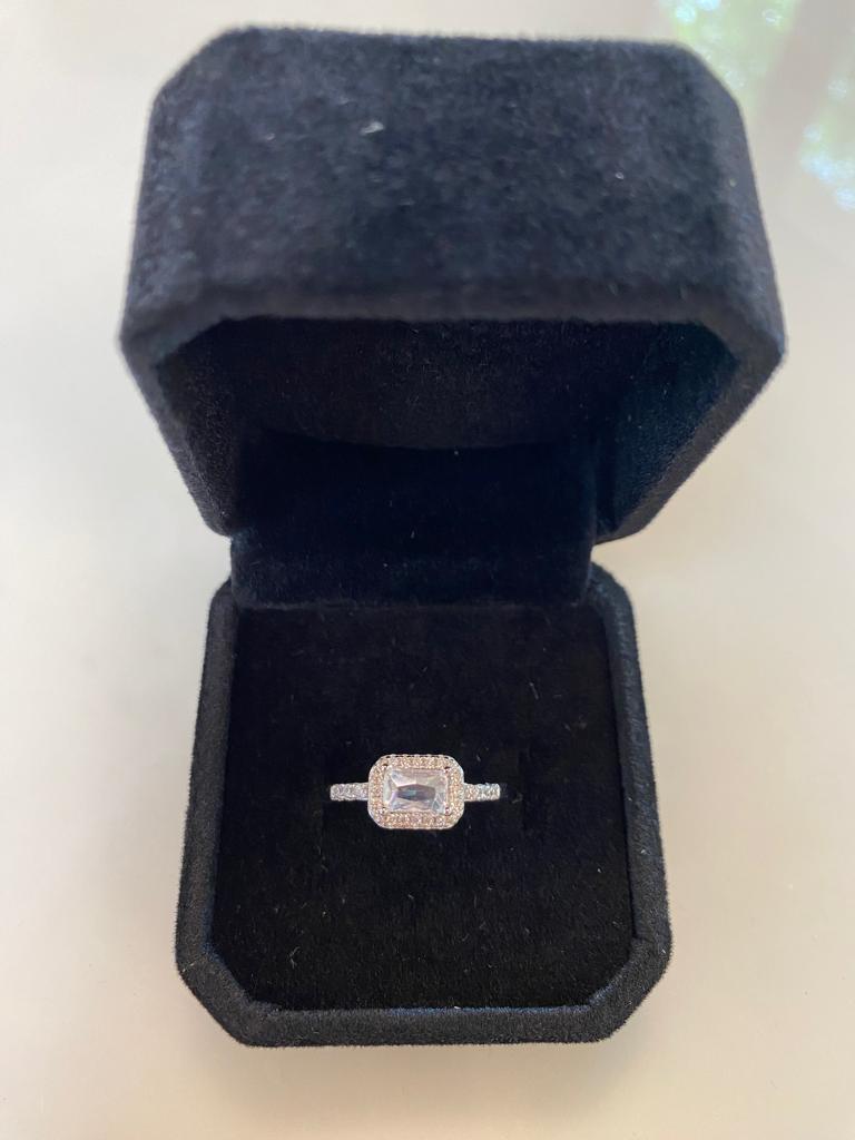 L'incastonatura del grande zircone centrale è circondata da una serie di piccoli zirconi crystal, che creano un delicato contorno scintillante attorno alla pietra principale. Questi zirconi più piccoli riflettono la luce in modo brillante, aggiungendo un tocco di luminosità e fascino all'anello.