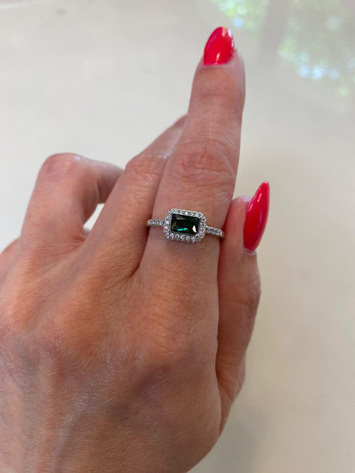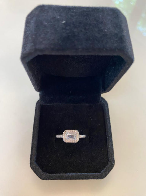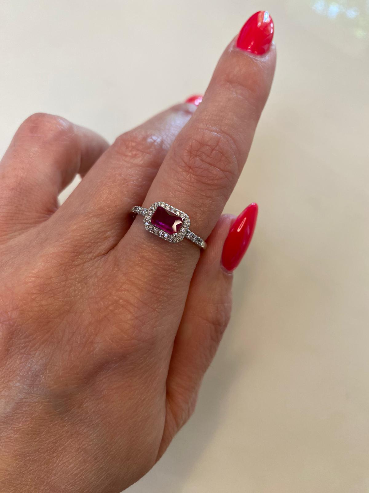 La forma rettangolare dell'anello gli conferisce un aspetto moderno e geometrico, mentre il design con il grande zircone colorato circondato dai piccoli zirconi crystal aggiunge un elemento di eleganza e sofisticazione. L'uso dell'argento come materiale principale dona all'anello una finitura liscia e lucente.