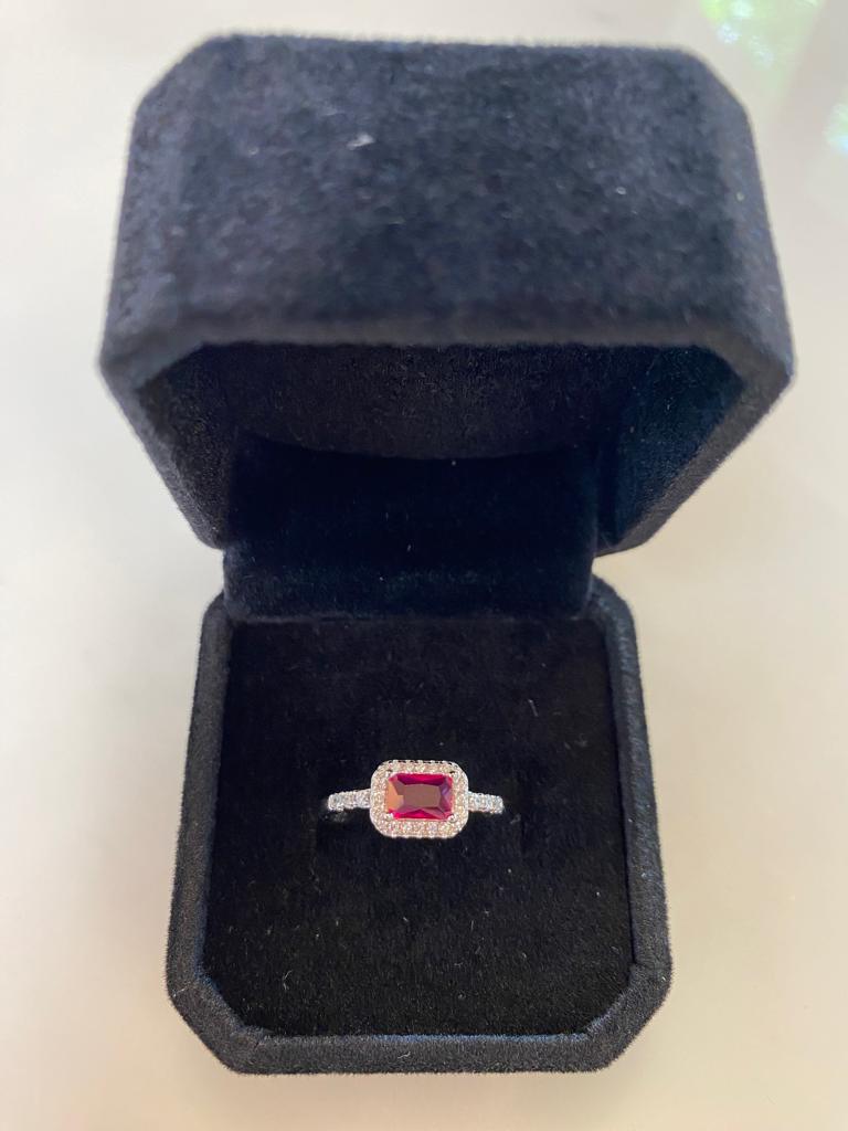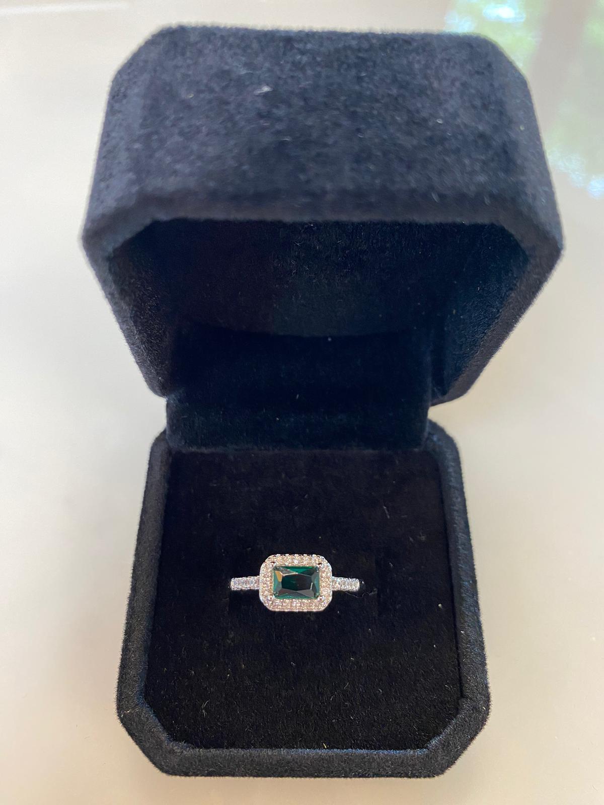 L'anello è realizzato in argento e presenta una forma rettangolare. La sua caratteristica principale è uno zircone centrale più grande, colorato e incastonato al centro dell'anello. Questo zircone centrale può variare nel colore a seconda delle preferenze.
