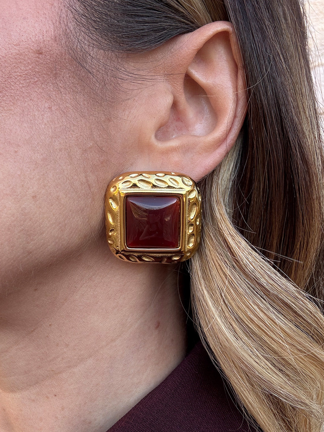 Orecchini a lobo dal design geometrico con inserto quadrato bordeaux e cornice dorata lavorata. Realizzati in acciaio inossidabile, eleganti e decisi, ideali per dare carattere al look.